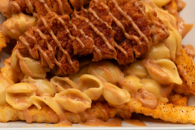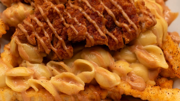 Creamy mac and cheese loaded with chicken tenders and the house Big Sauce.